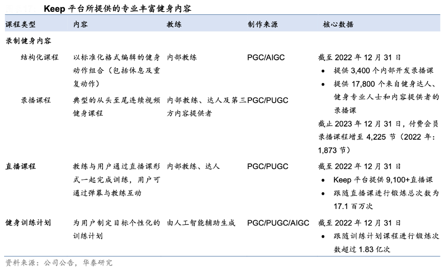 經(jīng)典案例:根據(jù)公司公告、華泰研究等綜合資訊表明,Keep 深化健身內(nèi)容布局,提供錄制、直播課以及訓(xùn)練計劃等內(nèi)容。錄制課方面,Keep 提供結(jié)構(gòu) 化課程、內(nèi)部開發(fā)且由內(nèi)部教練或達(dá)人示范的視頻課程以及健身百科知識,課程內(nèi)容涵蓋 力量訓(xùn)練、有氧運(yùn)動、舞蹈、拳擊、拉伸、瑜伽等內(nèi)容。截至 2022 年末,Keep 提供 17,800 個錄播課;用戶跟隨錄播課的鍛煉次數(shù)達(dá) 13 億次。